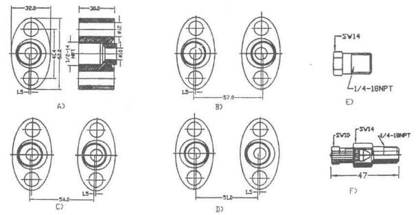 差壓變送器法蘭為1/4" -18NPT錐管連接螺紋。引壓管線可以通過1/4" -18NPT錐管連接管頭直接安裝在差壓變送器法蘭上,正負兩根引壓管間距為54mm。這種安裝方式雖然簡單但不利于差壓變送器調整和拆卸;引壓管線也可以通過三通閥安裝在差壓變送器法蘭上(三通閥須自備或特別定購),引壓管線也可以通過橢圓法蘭安裝在差壓變送器法蘭上,橢圓法蘭為1/2”-14NPT錐管連接螺紋,通過擰下橢圓法蘭固定螺桿,使差玉變送器很方便地從工藝流程引壓管線上拆下來。可以通過橢圓法蘭改變引壓管徑,也可通過改變-一個或個橢圓法蘭尺寸, 圖B) C)D)為橢圓法蘭不同安裝角度尺寸。圖E) F)為EJA差壓變送器法蘭密封絲堵和放氣排污閥。注:橢圓法蘭、密封絲堵和放氣排污閥為選購件。